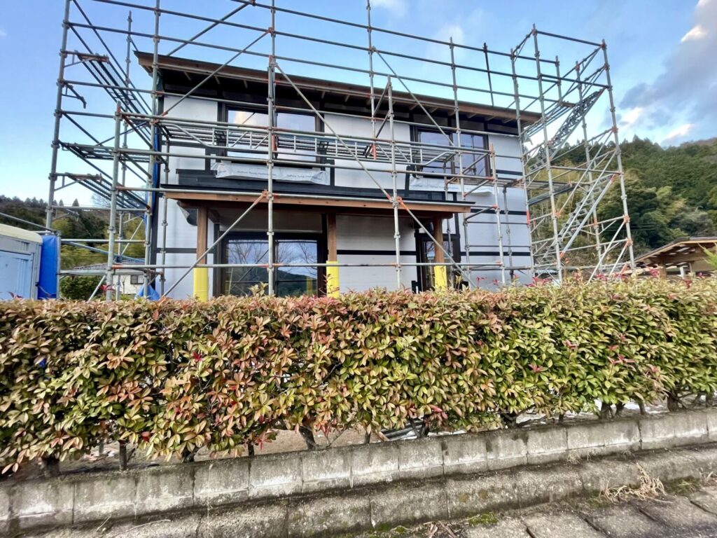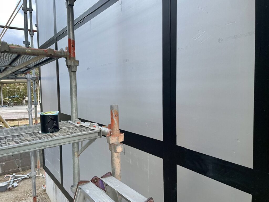 屋外では、外張り断熱材の施工が進んでおります。