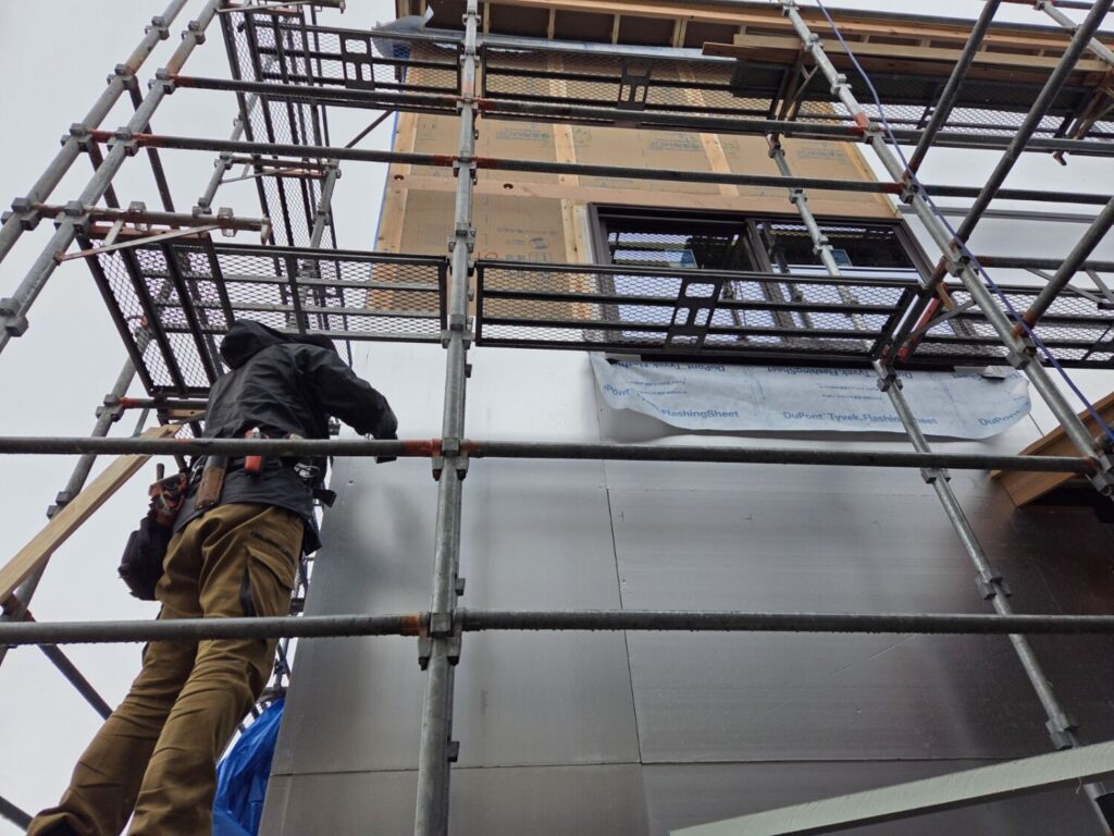 屋外では、外張り断熱材の施工が進んでおります。