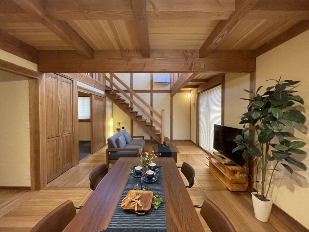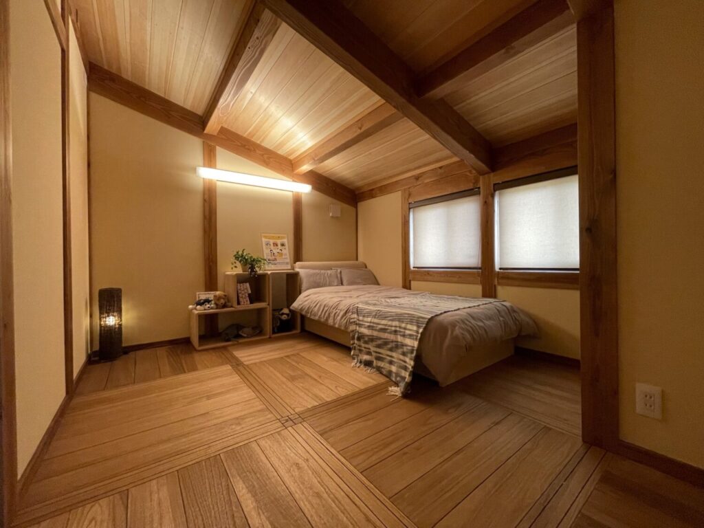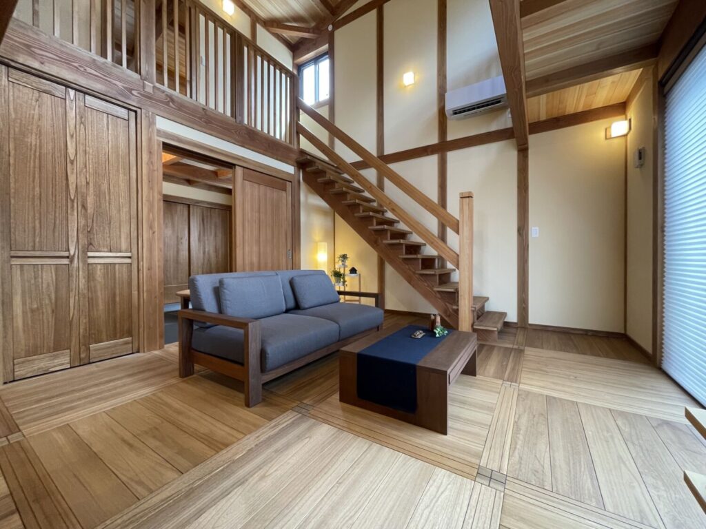 頼もしい米松(べいまつ)の太梁(ふとばり)とグリッドの梁格子(はりごうし)、