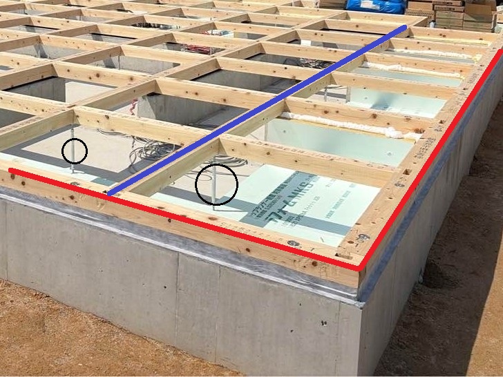 下の写真、赤線でお示しした土台(どだい)と呼ばれる木材は、