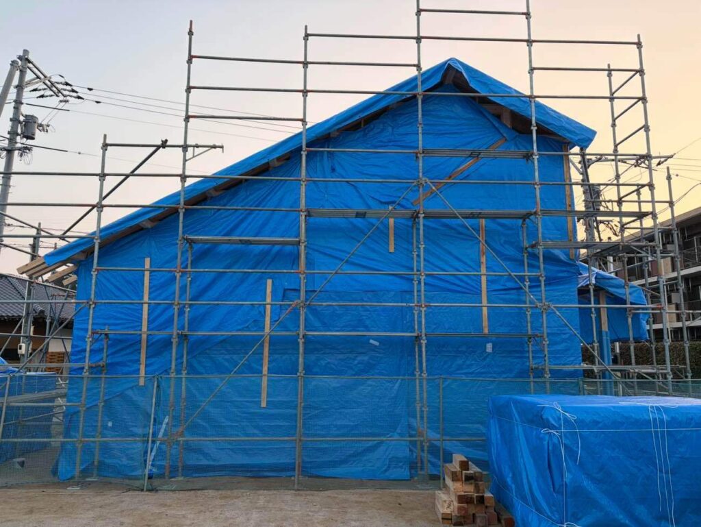 棟上げの当日、まずは雨対策で覆われていたシートを外し、